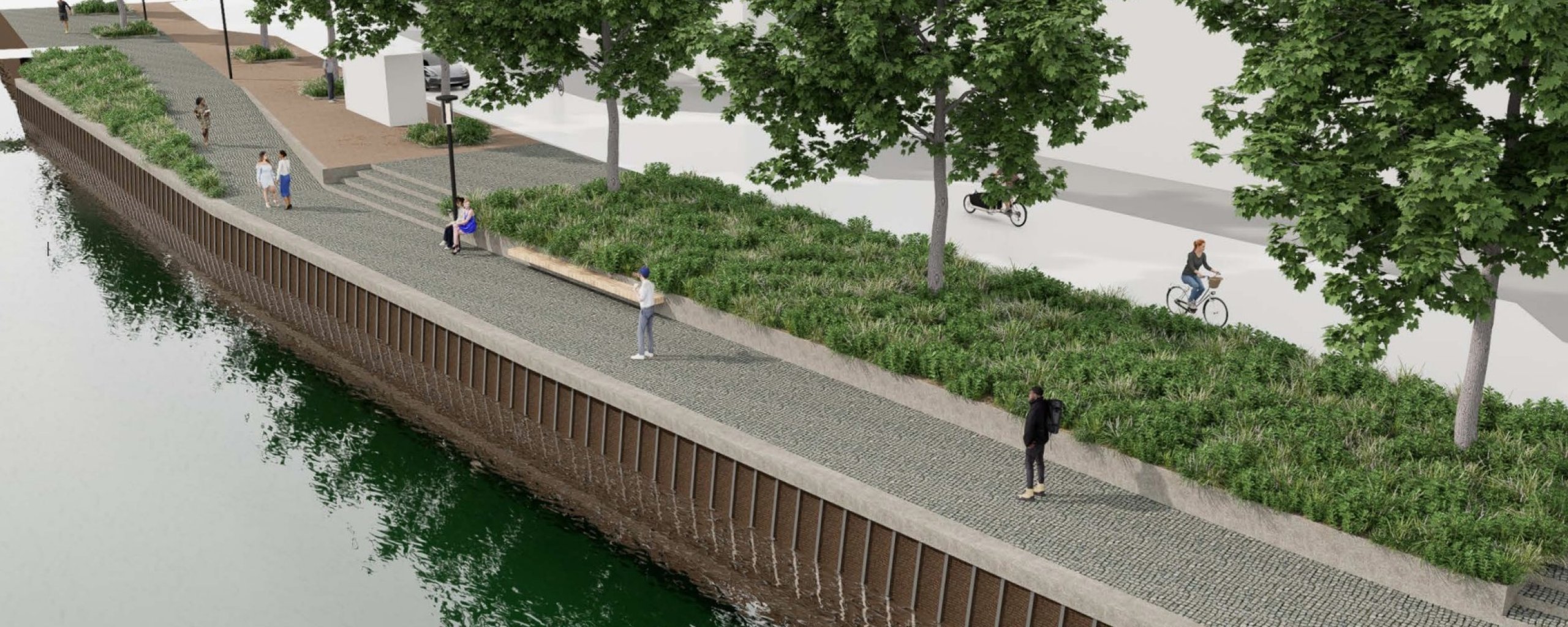 - Inrichten openbare ruimte tussen de kademuur en de weg van Koningsbrug tot St. Jansvoetbrug.